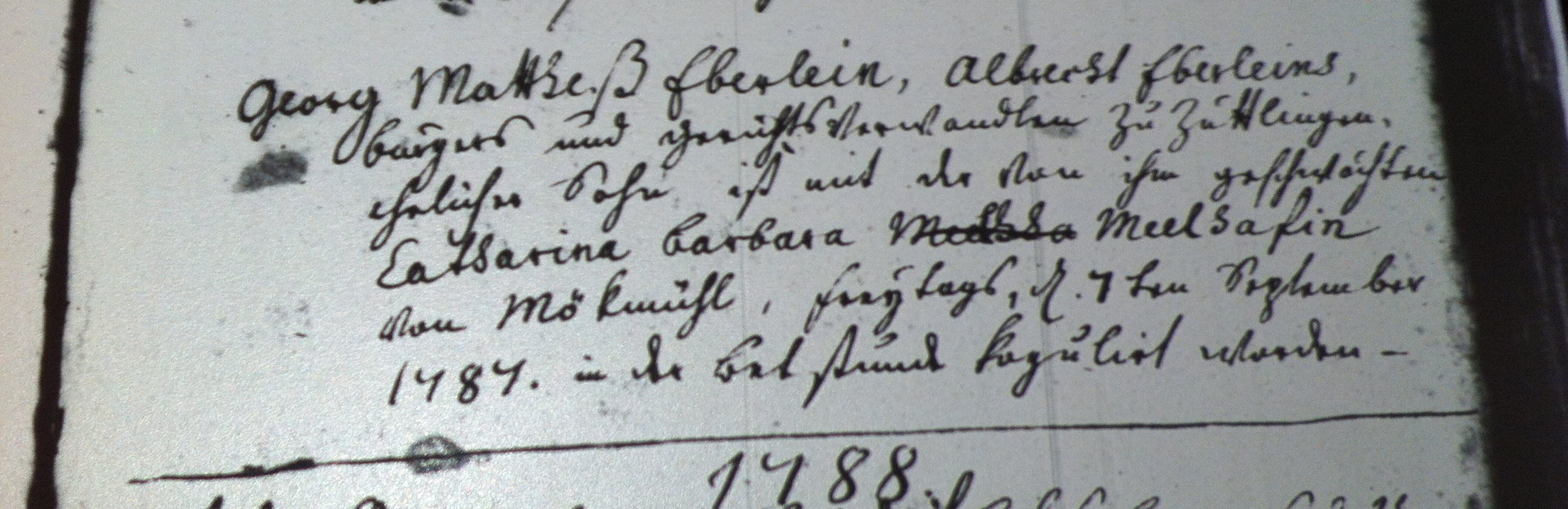 Heinrich Eberlein died 16 June 1736 in Züttlingen. The next year, his widow gave birth to an illegitimate child, Chatarina Barbara, fathered by Albrecht Philipp Gauer. It’s unusual that the two god parents were single women.