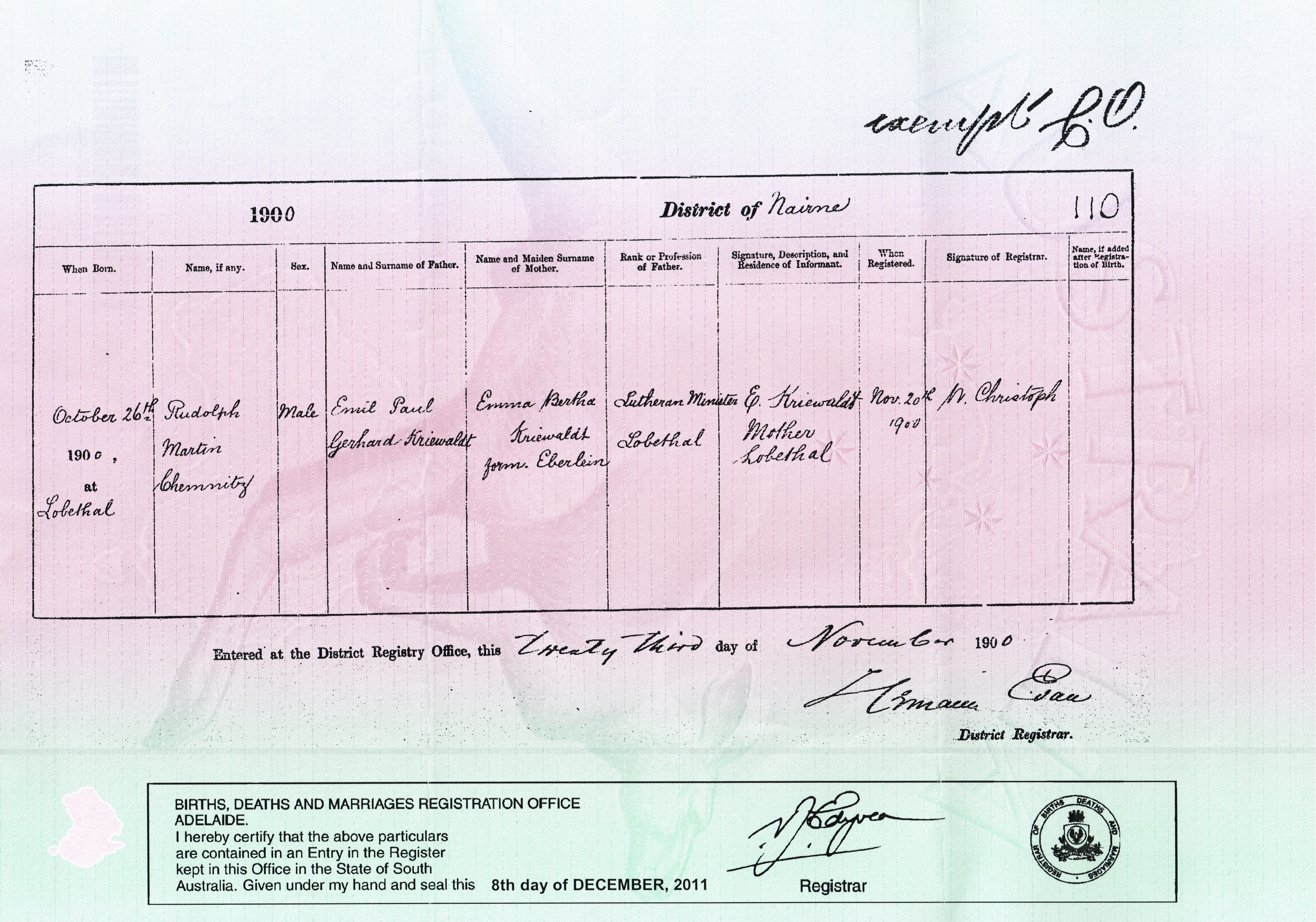 Birth certificate, Martin Chemnitz Kriewaldt
